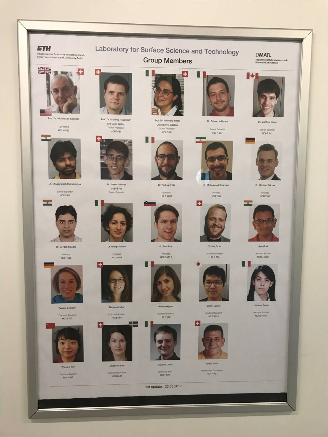 我所所长刁东风教授于2017年6月2日-3日访问了瑞士苏黎世联邦理工学院(ETH Zurich – Swiss Federal Institute of Technology Zurich,2017年《泰晤士报高等教育》排名第22位,QS排名第10位),与材料学院的Professor Nicholas D.Spencer(Tribology Letters 主编)进行了交流。首先我所所长介绍了纳米所近年在纳米结构碳膜的设计制造及光机电特性评价所取得的研究成果以及深圳大学近年来开展国际化合作研究方面的成就;Spencer教授(曾担任该校近10年的研究委员会主席,校级材料研究中心主任,材料学院院长)介绍了他们最新在人工皮肤摩擦学以及超光滑表面制造工艺所取得的成绩。双方就各自特长领域产生了交叉合作研究的共鸣以及在超光滑碳纳米结构薄膜与人工皮肤摩擦发电两点共同研究方面达成共识。研讨会结束之后Prof.Spencer亲自现场介绍了他们的表面科学与技术研究所团队及实验室。